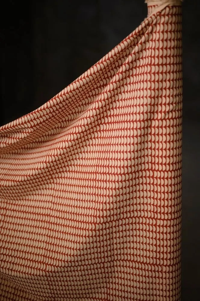 A Bagru block print in warm red. Bagru, a small village in Rajasthan, 35 kilometres from Jaipur, is known for its hand block printing utilising traditional processes and natural colours. Bagru prints tend to be more simple with limited colours in comparison to Sanganer block prints which are more colourful with finer detail. Block printing is still practiced by the Chippa community, who have lived here for over 400 years.