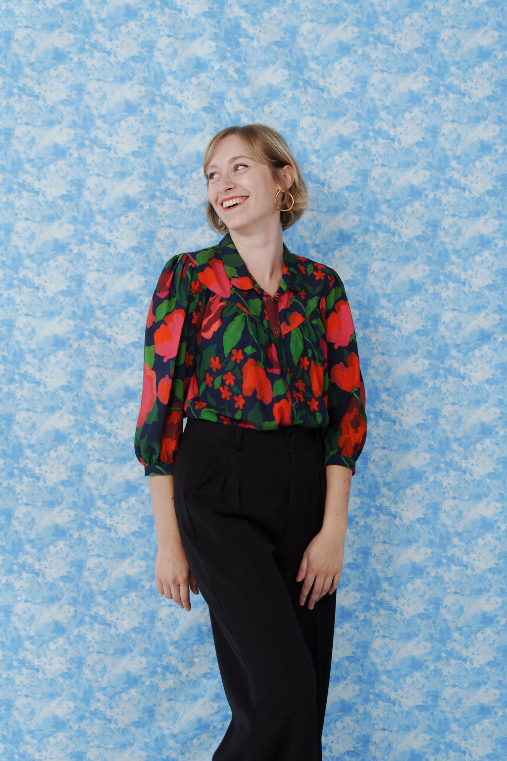 Model wearing a colourful floral blouse, made with La Roseraie Viscose fabric, in front of a plain background