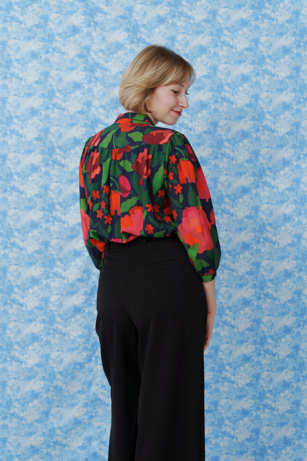 • Load image into Gallery viewer, Back view of model wearing a colourful floral blouse, made with La Roseraie Viscose fabric, stood in front of a patterned background