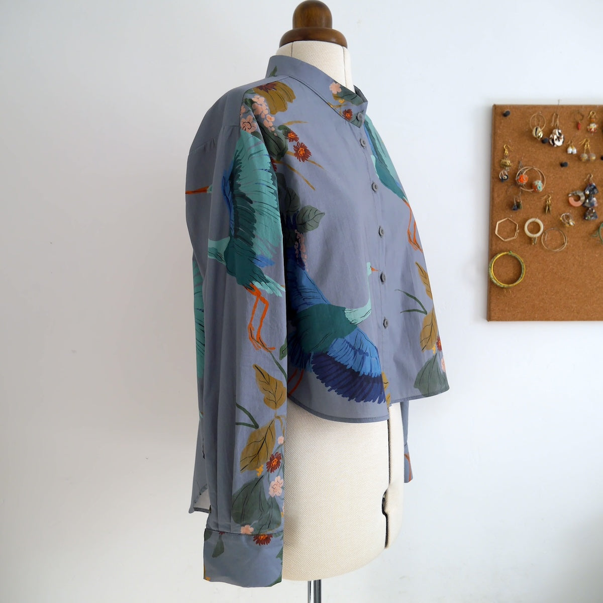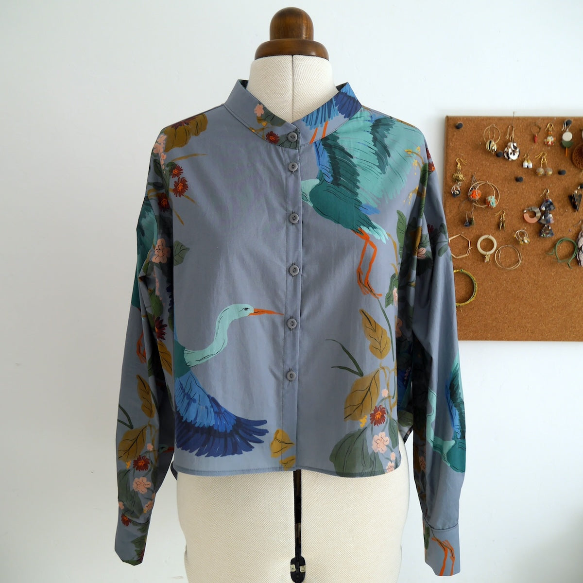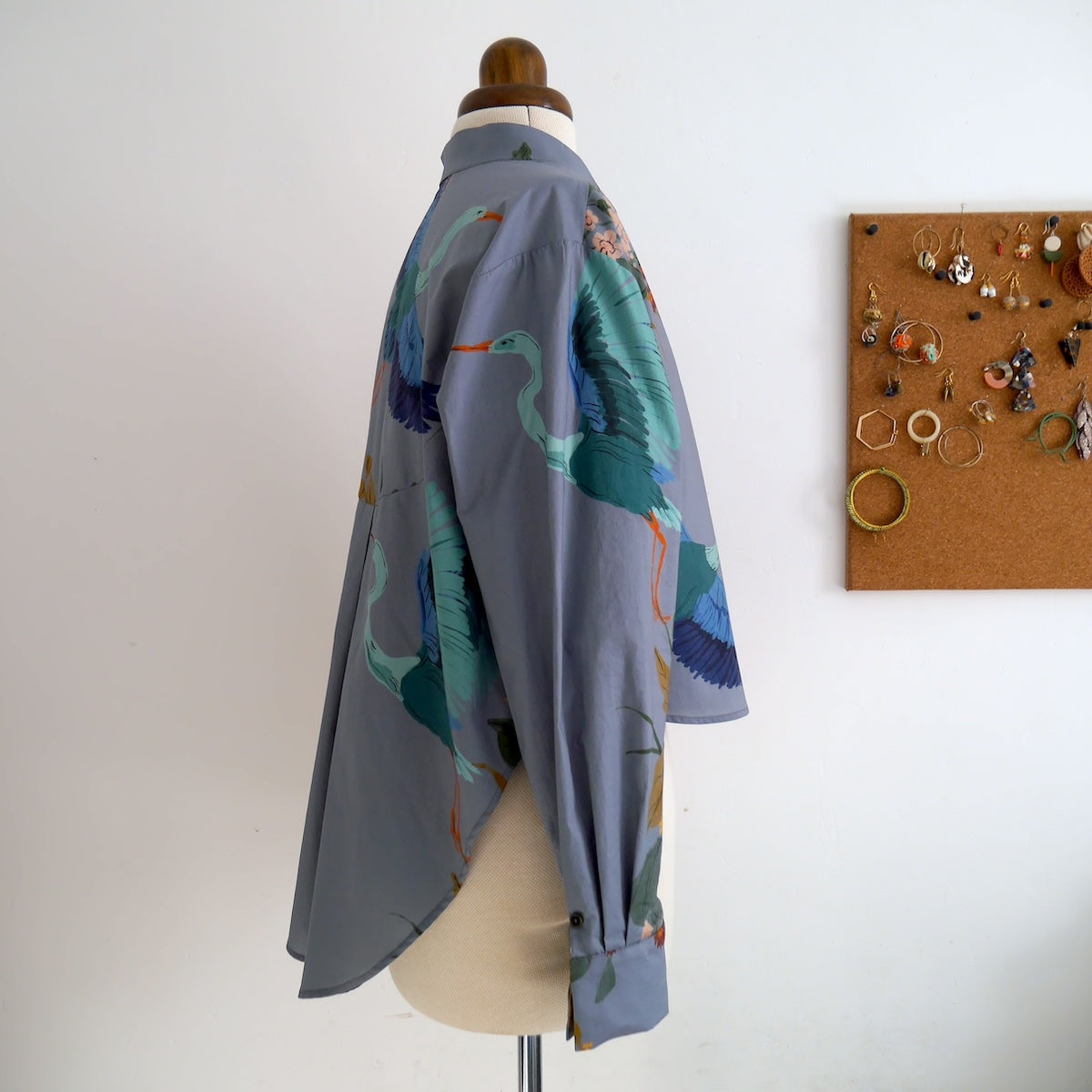 Lady McElroy fabric with a large print of herons in flight, on a grey background.